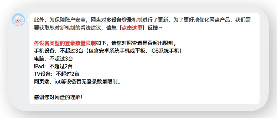 - 如果有频繁使用网盘的需求,可考虑通过手机端、网页端操作,减少对 PC 设备登录名额的占用。